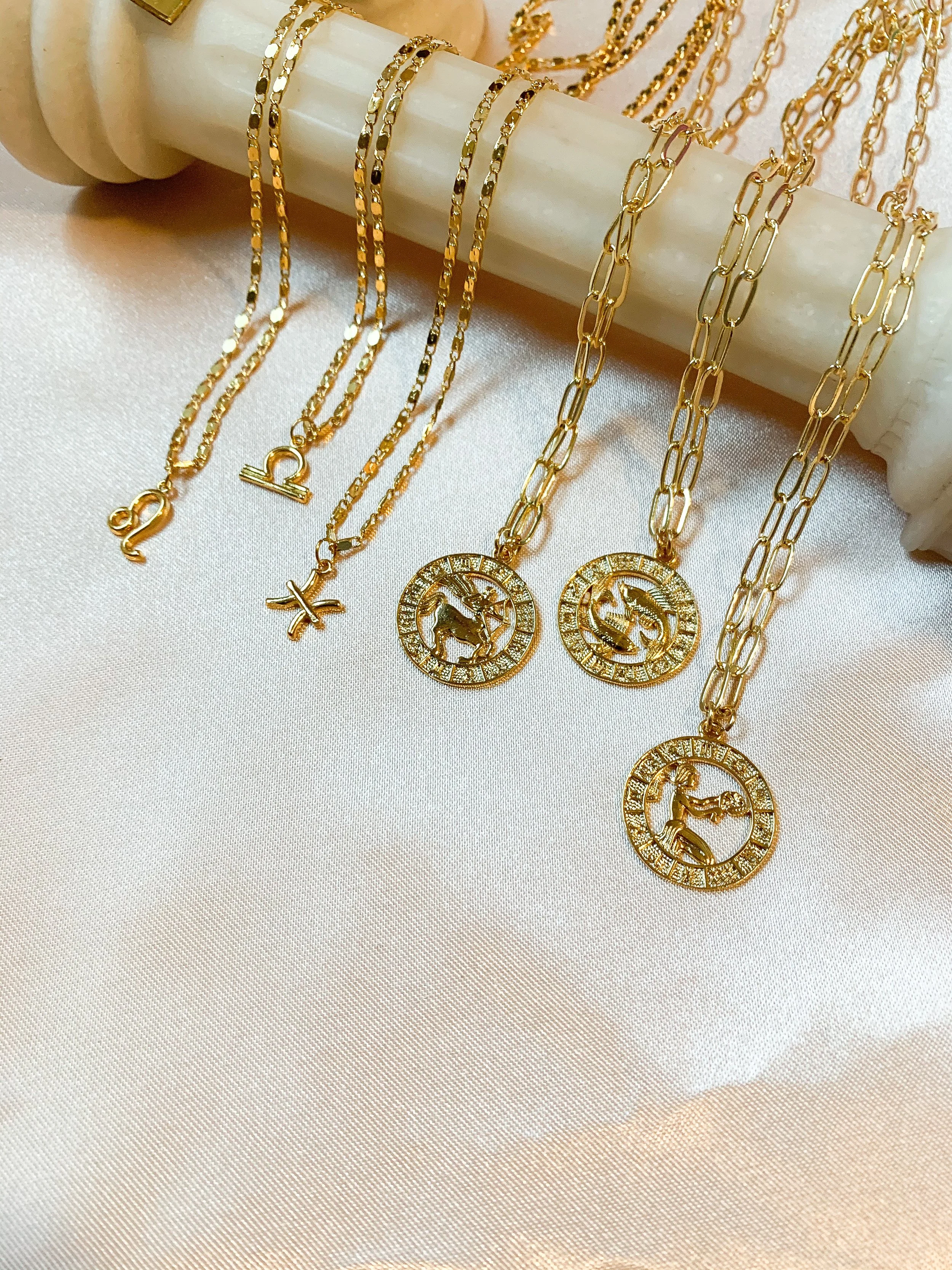 14K Gold Plated Paperclip Chain with Zodiac Sign Circle Pendant