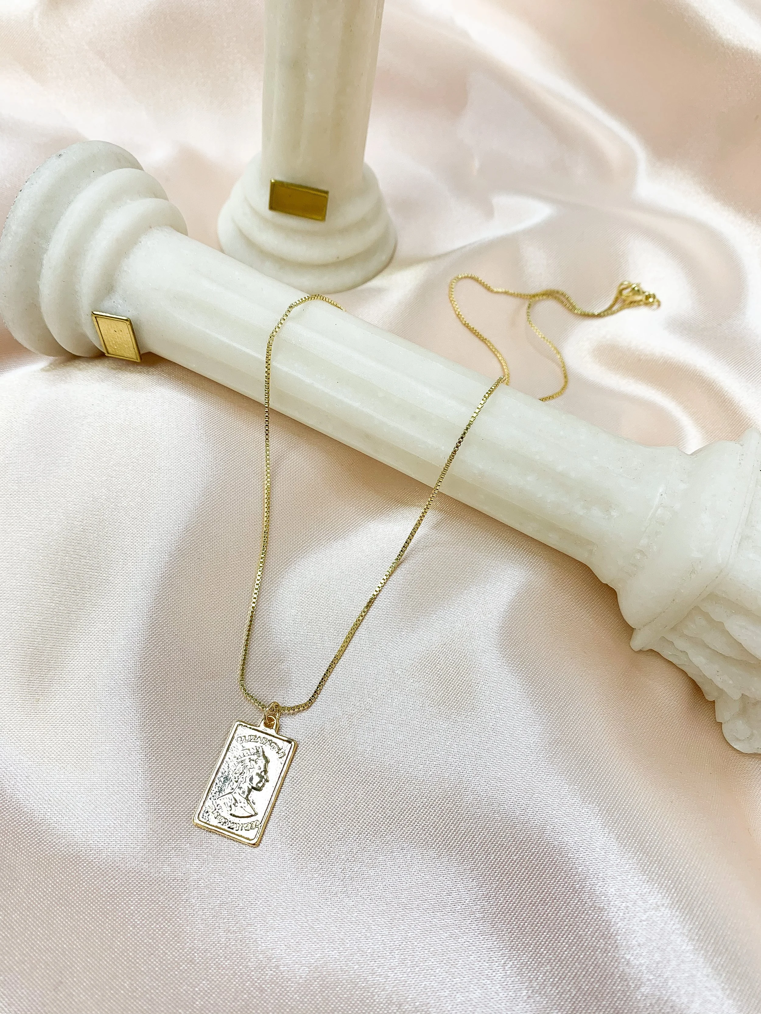 Image 1 of 1 Elizabeth Necklace $30.00 sold out 18K Gold Plated Elizabeth Pendant Box Chain Necklace Chain Length - 18” Chain Thickness - 0.8mmPendant Size - 12x22mm Sold Out Added! 18K Gold Plated Elizabeth Pendant Box Chain Necklace Chain Length - 18” Chain Thickness - 0.8mmPendant Size - 12x22mm